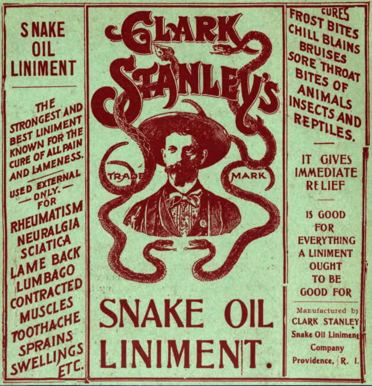 These types of elixirs were known as patent medicines. They would take many forms, almost always advertised by an alluring character (Cowboy Clark Stanley for example) and feature some form of secret ingredient. In an age of limited entertainment, Stanley would take his caravan across the USA and put on shows. These were extravagant productions where Stanley would take a live rattlesnake and squeeze the life from it in front of a captivated crowd. He’d throw the dead snake into a mysterious steaming broth where it would simmer. Soon an oily meniscus would form which Stanley would skim off the top and pour into a bottle and sell for a tidy profit to the enraptured people who stood before him.