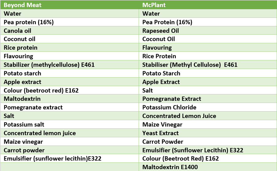 The UK requires the ingredients for any food to be listed in order of weight. This gives an interesting insight into how McDonald’s have changed Beyond Meat’s recipe: